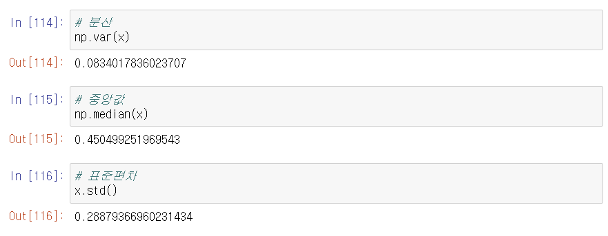 3) var() : 분산, median() : 중앙값, std() : 표준편차