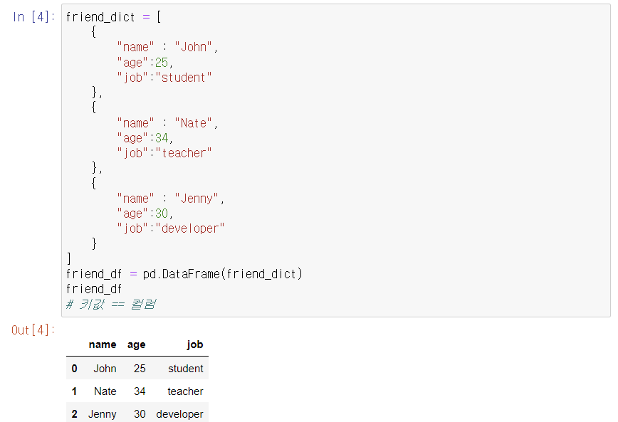 - 엑셀/csv와 같이 데이터가 row, column으로 구성