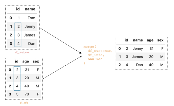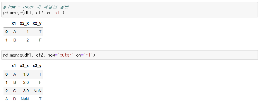 - merge(데이터프레임1, 데이터프레임2) : 두 데이터프레임에 동일한 이름을 가진 컬럼을 기준으로 두 데이터프레임을 합침