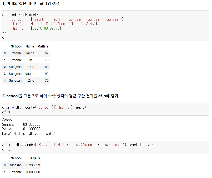 2) school을 그룹으로 하여 수학 성적의 평균 구한 결과를 df_s에 담기
