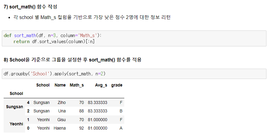 8) School을 기준으로 그룹을 설정한 후 sort_math() 함수를 적용