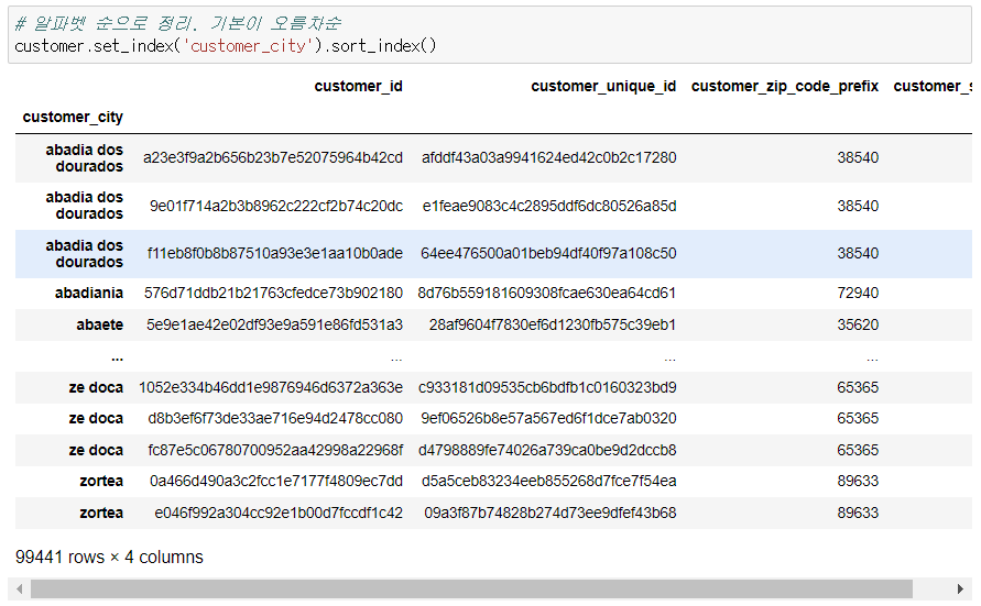 13) customerdptj customer_city를 인덱스로 만들고, 알파벳 순으로 인덱스를 정렬