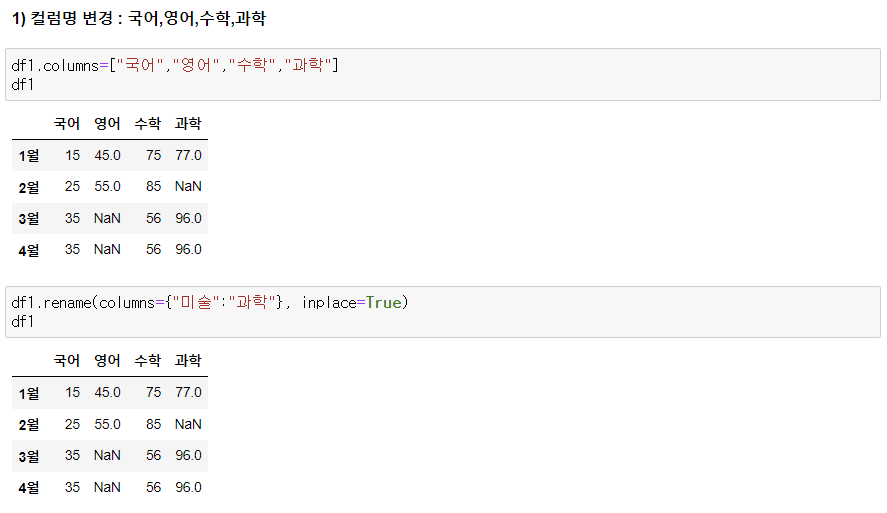 1) 컬럼명 변경 : 국어, 영어, 수학, 과학