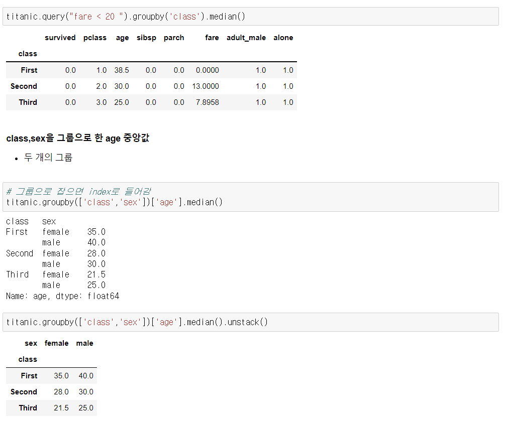 9) 요금 지불 금액이 20보다 작은 승객들만 class 별로 묶어서 중앙값