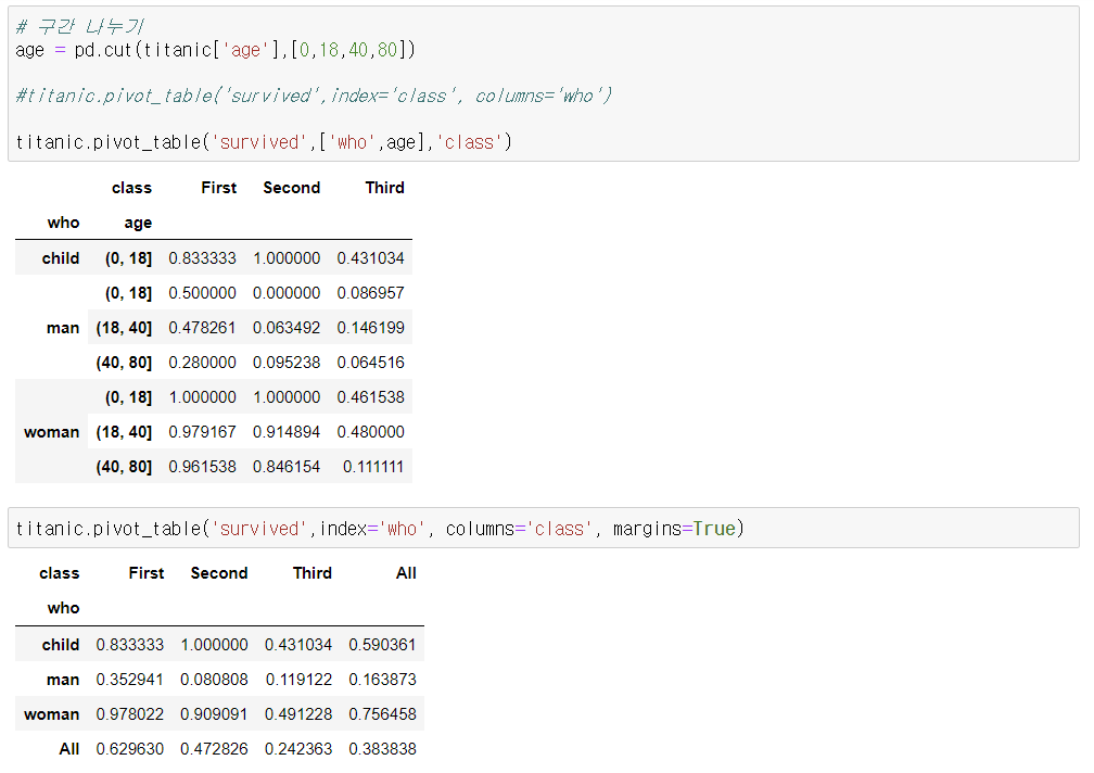 - cut(데이터, 구간, 구간 레이블) : 'survived',['who',age],'class'