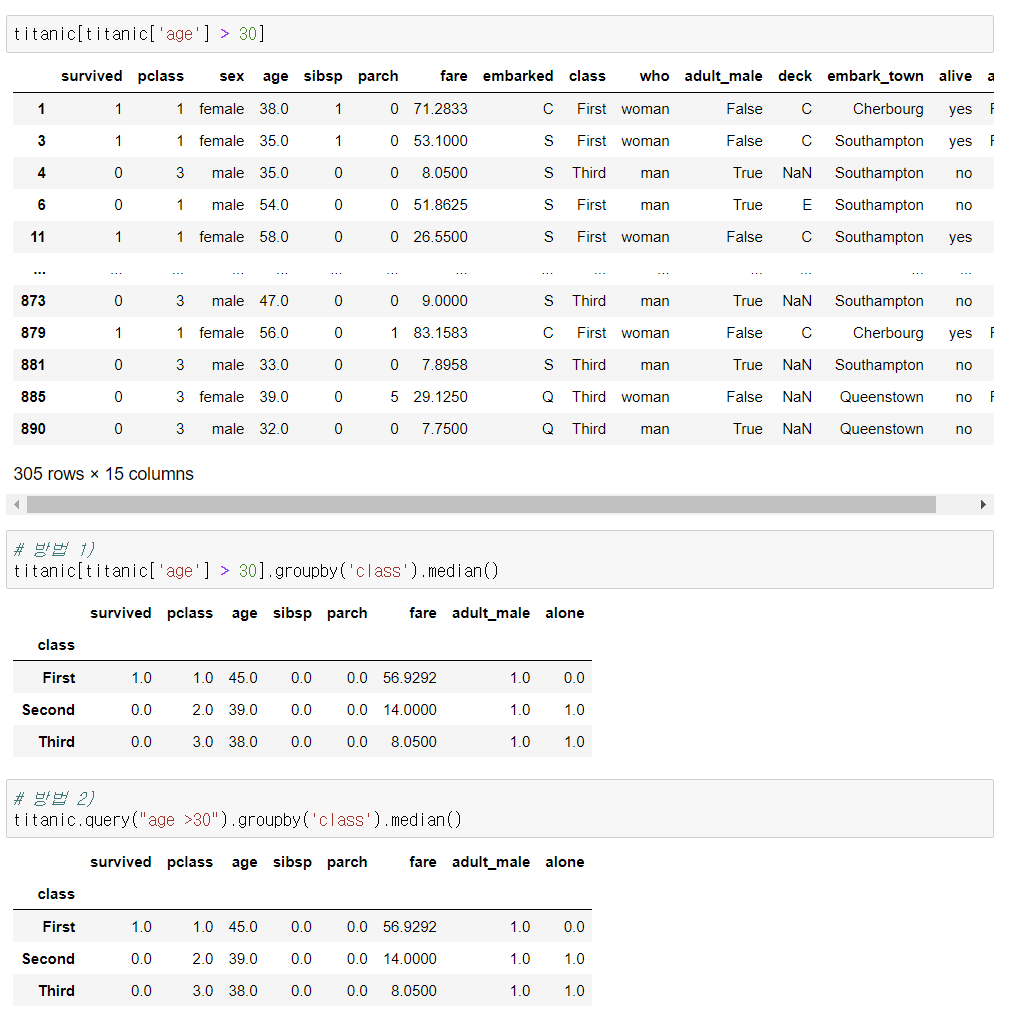 8) 나이가 30세 초과인 승객들만 class별로 그룹으로 묶어 중앙값