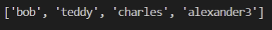 strings = ["bob", "charles", "alexander3", "teddy"]