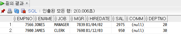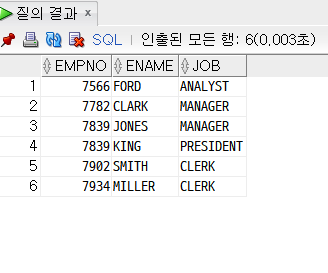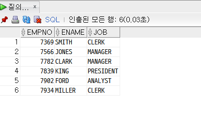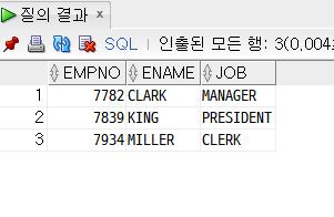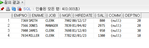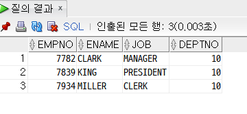 ex) SELECT empno, ename, job FROM emp WHERE deptno = 10