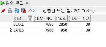 AND sal NOT BETWEEN 1000 AND 2000;