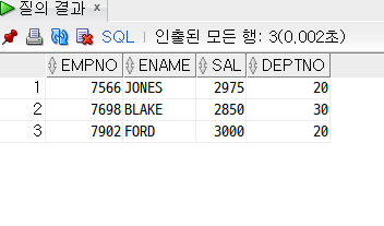 4) NOT BETWEEN A AND B 연산자를 쓰지 않고, 급여(SAL) 열 값이 2000 이상 3000이하 범위 이외의 값을 가진 데이터만 출력