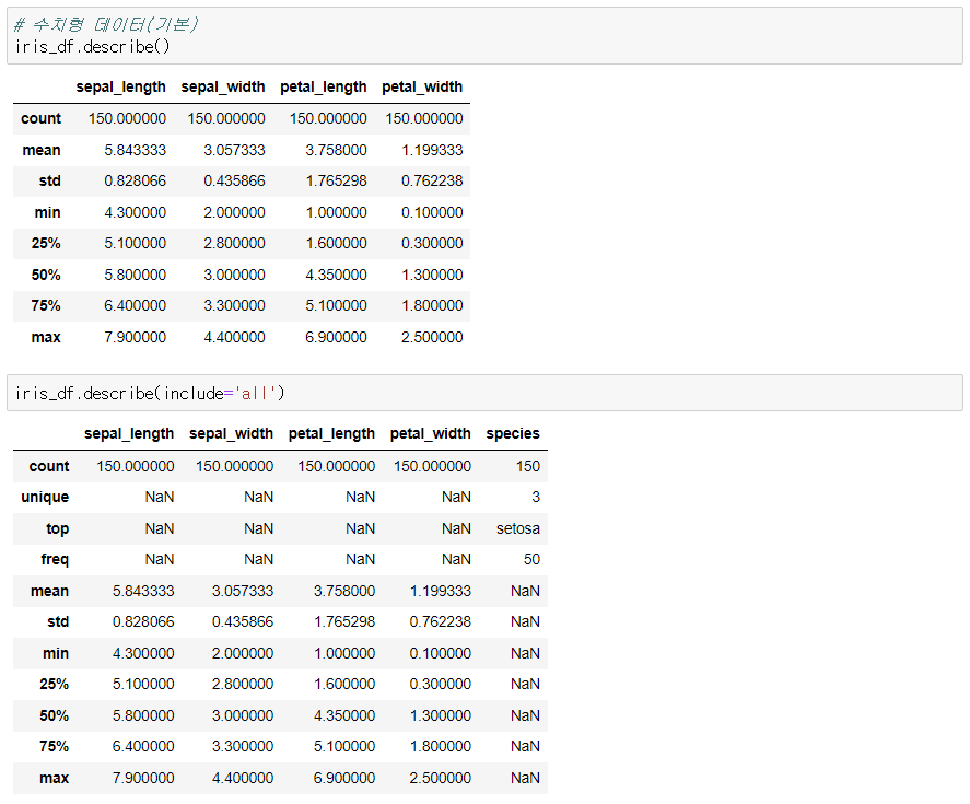 5) describe() : 기술 통계 정보(분산, 최대, 최소, count, 표준편차, quantile)