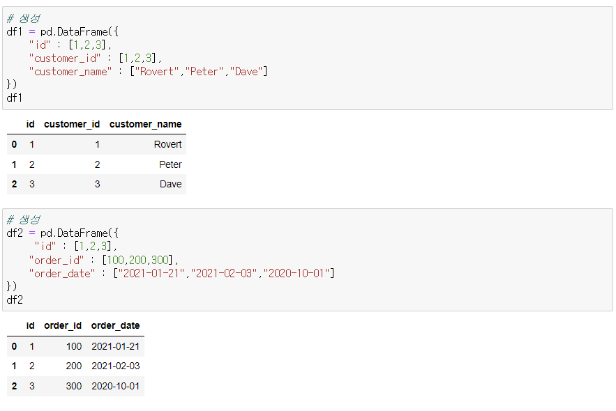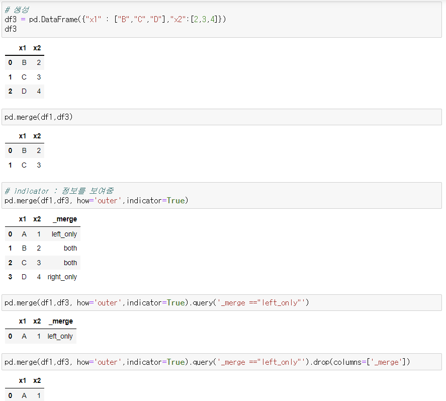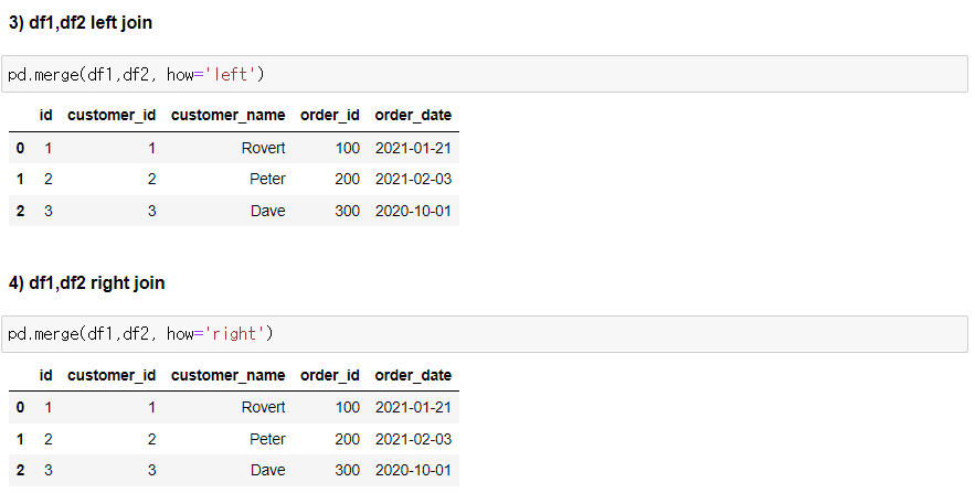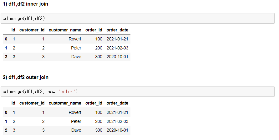 - merge(데이터프레임1, 데이터프레임2) : 두 데이터프레임에 동일한 이름을 가진 컬럼을 기준으로 두 데이터프레임을 합침