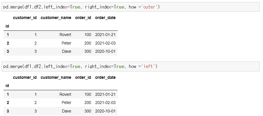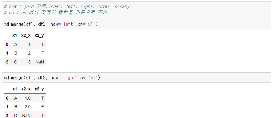 - merge(데이터프레임1, 데이터프레임2) : 두 데이터프레임에 동일한 이름을 가진 컬럼을 기준으로 두 데이터프레임을 합침