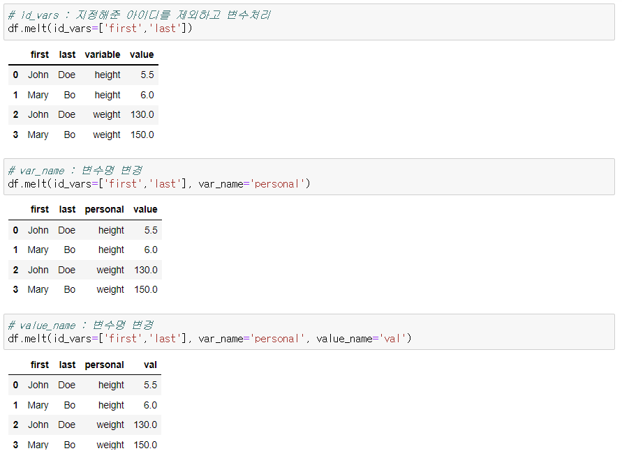 - 1 개 이상 열들을 식별자 변수 형식으로 재형성
