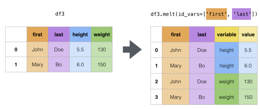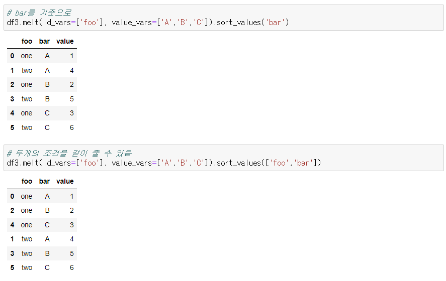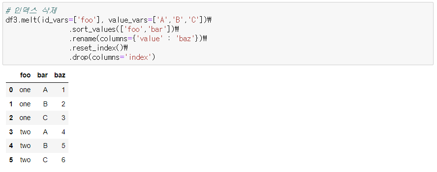 pivot 이 적용된 데이터 프레임을 melt를 써서 처음과 유사하게 만들어보기