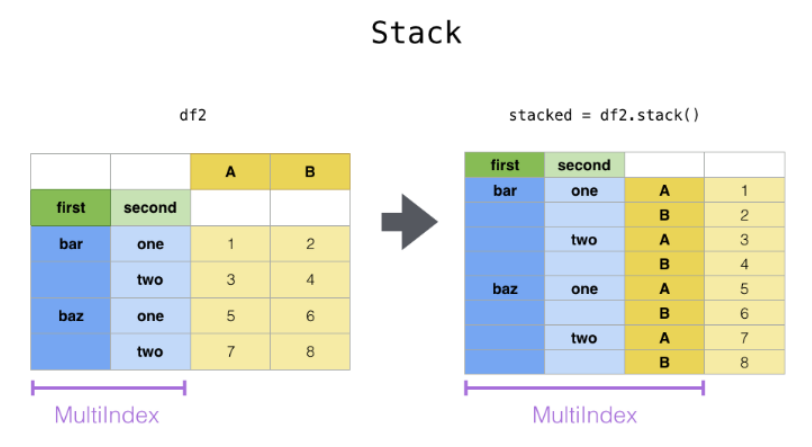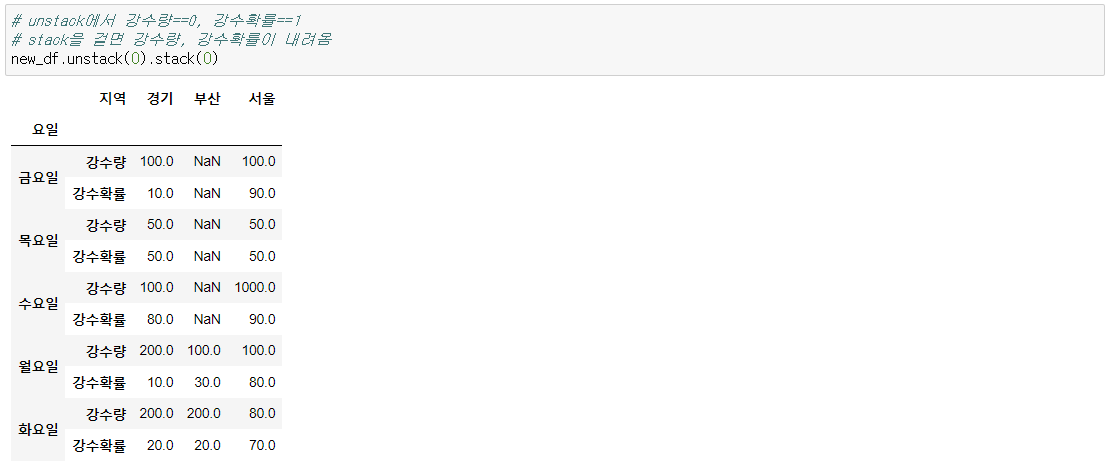 - stack:컬럼 레벨에서 인덱스 레벨로 dataframe 변경