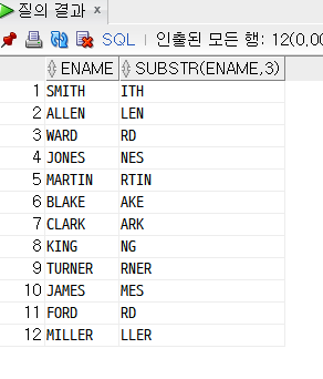 실습) emp 테이블의 모든 사원 이름(ename)을 세번째 글자부터 끝까지 출력