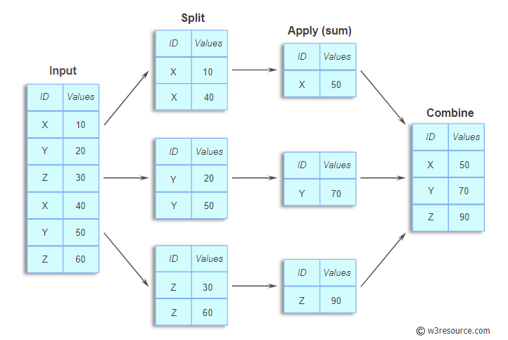- 원본 데이터 셋을 그룹별로 분할(split)