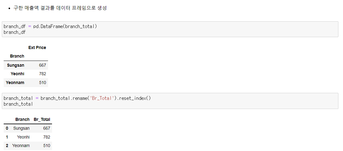 - 구한 매출액 결과를 데이트프레임으로 생성