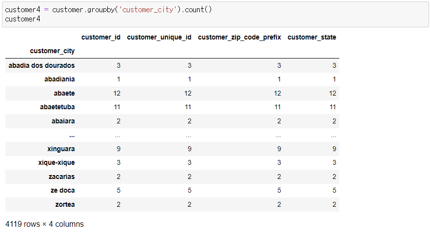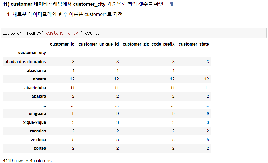 11) customer 데이터 프레임에서 customer_city 기준으로 행의 갯수를 확인