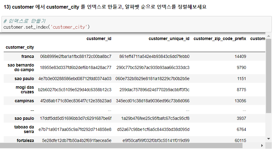 13) customerdptj customer_city를 인덱스로 만들고, 알파벳 순으로 인덱스를 정렬