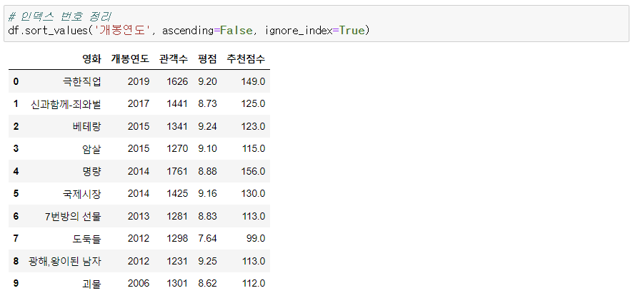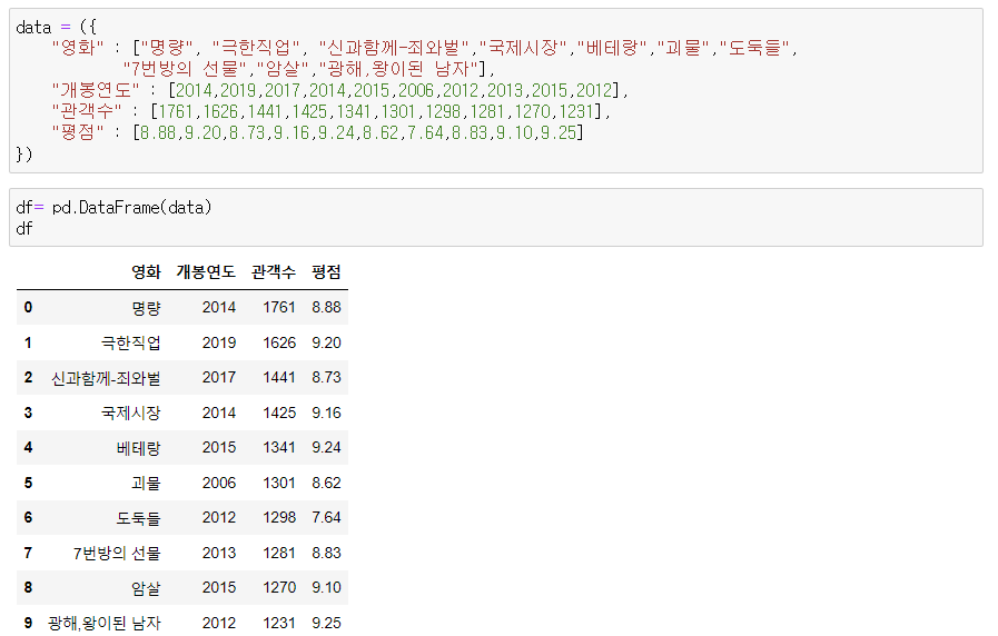 [문제] 다음은 대한민국 영화중에서 관객 수가 가장 많은 상위 10개의 데이터입니다.