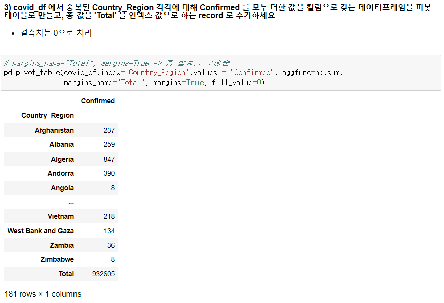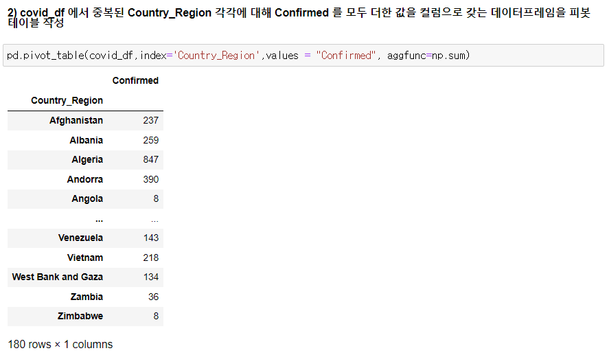 2) covid_df 에서 중복된 Country_Region 각각에 대해 Confirmed 를 모두 더한 값을 컬럼으로 갖는 데이터프레임을 피봇테이블 작성