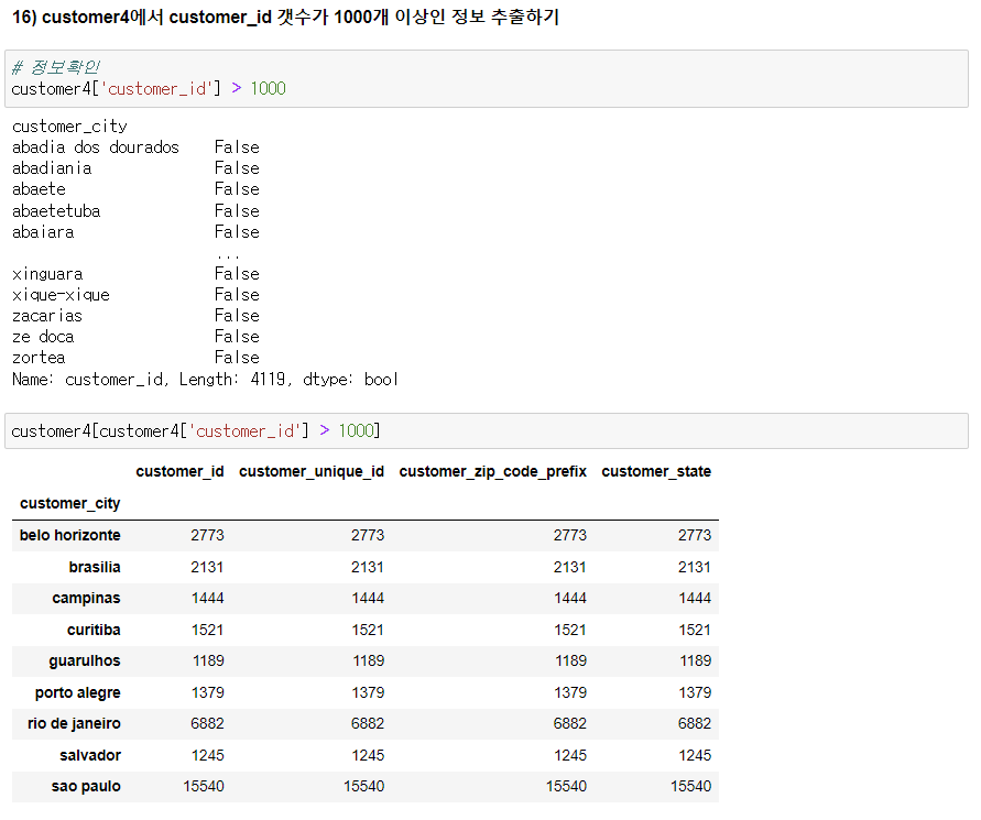17) customer4에서 customer_id 갯수가 1000개 이상인 customer_city 이름 확인