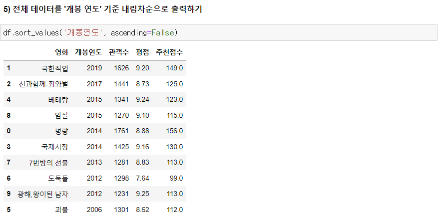5) 전체 데이터를 '개봉 연도' 기준 내림차순으로 출력
