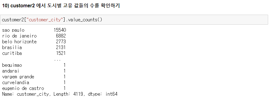 10) customer2에서 도시별 고유 값들의 수를 확인하기