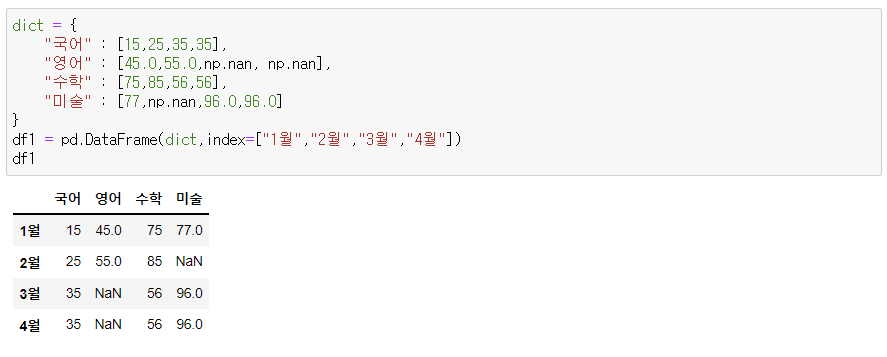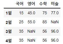 1) 컬럼명 변경 : 국어, 영어, 수학, 과학