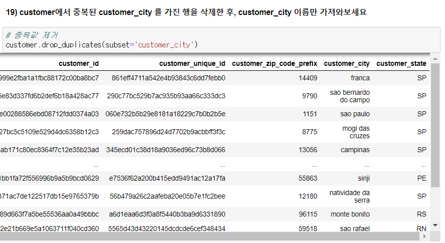 19) customer에서 중복된 customer_city를 가진 행을 삭제한 후, customer_city 이름만 출력