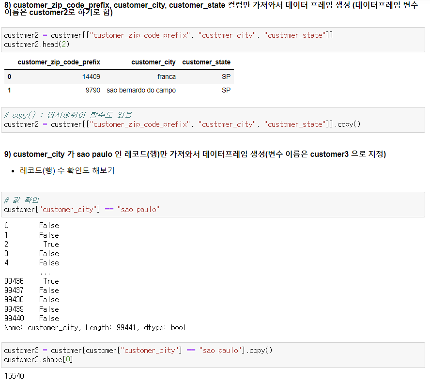 9) customer_city가 sao paulo 인 레코드(행)만 가져와서 데이터프레임 생성(변수 이름은 customer3 으로 지정)