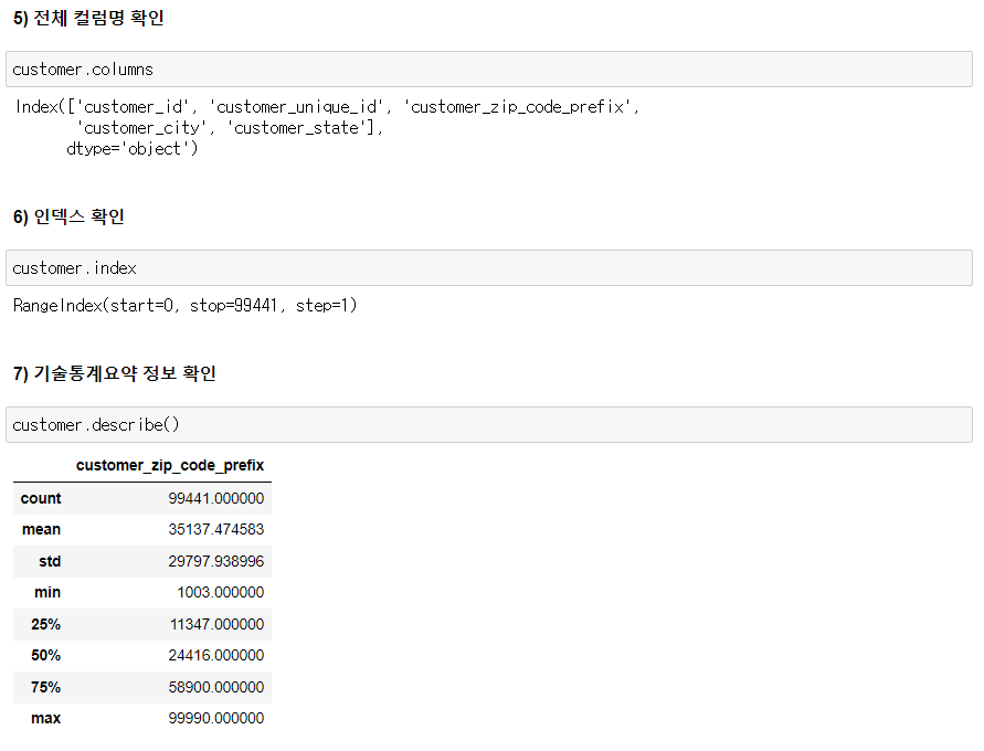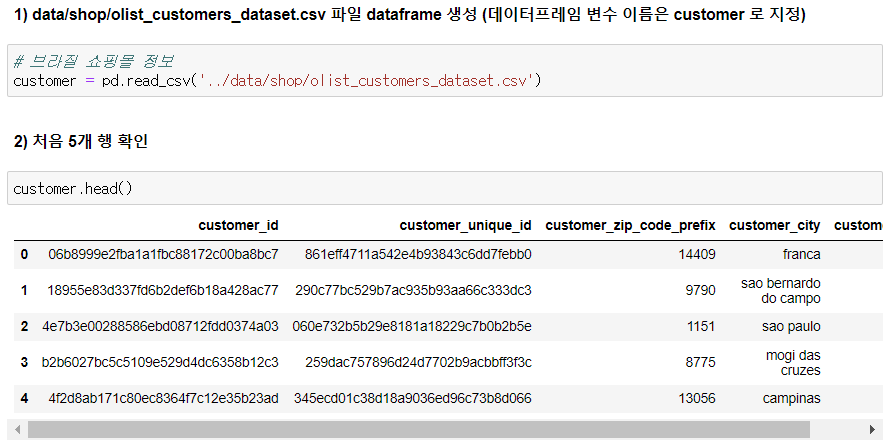 1) data/shop/olist_customers_dataset.csv 파일 dataframe 생성(데이터 프레임 변수 이름 customer로 지정)