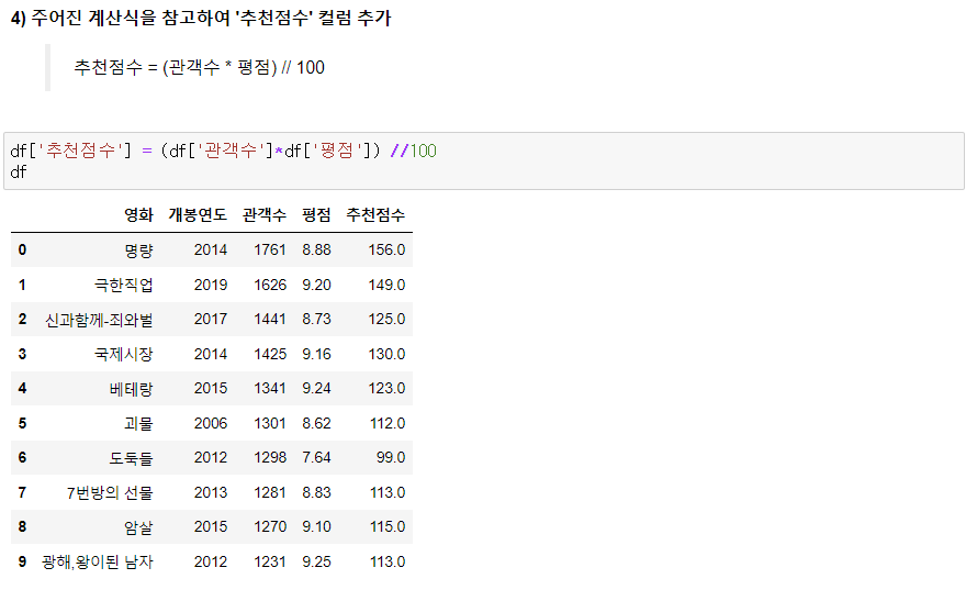 4) 주어진 계산식을 참고하여 '추천점수' 컬럼 추가