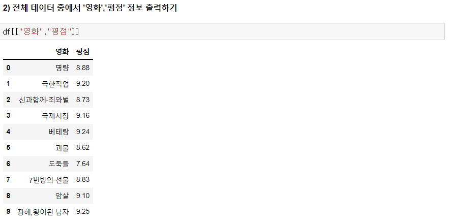 2) 전체 데이터 중에서 '영화','평점' 정보 출력