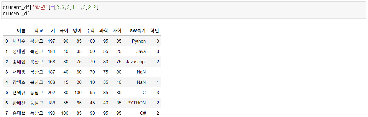 1) 학년 컬럼 추가 : [3,3,2,1,1,3,2,2]