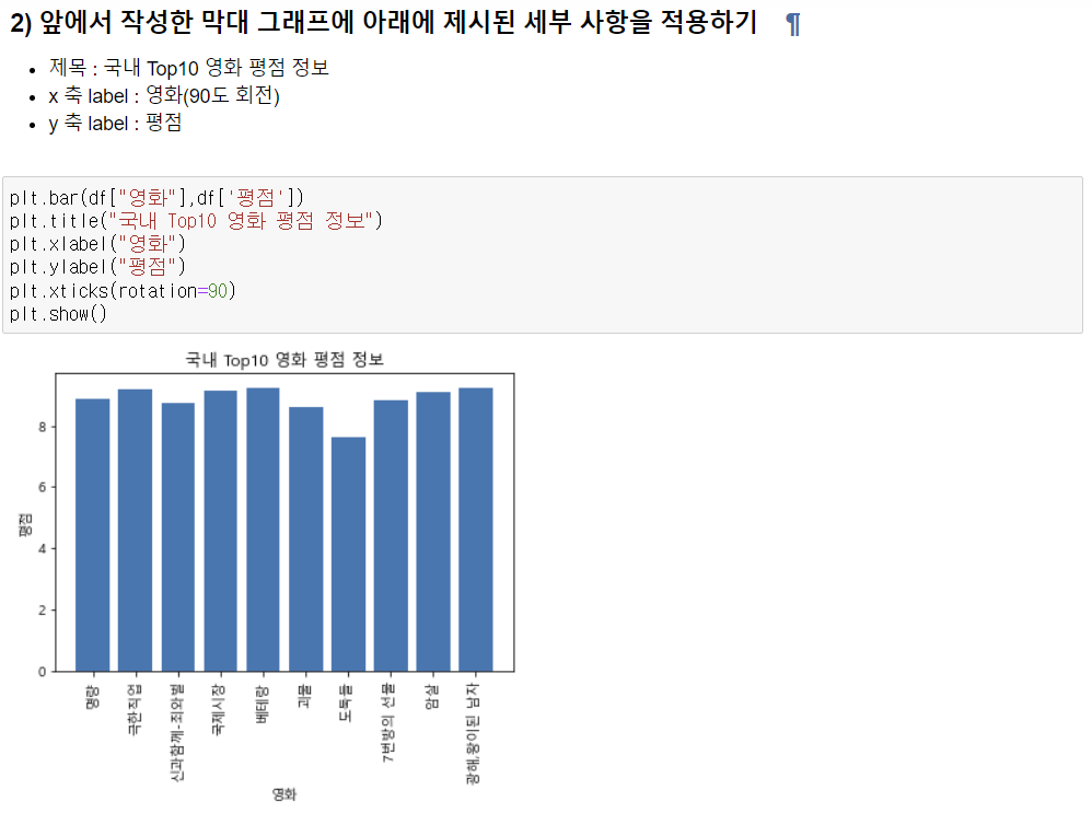 1) 영화 데이터를 활용하여 x축은 영화, y축은 평점인 막대 차트 작성