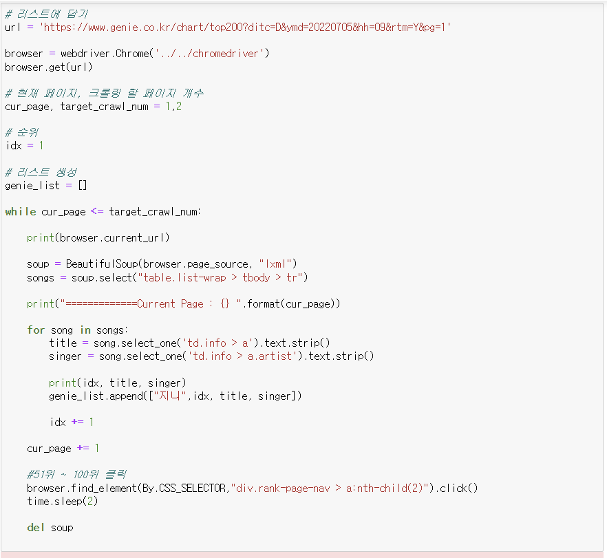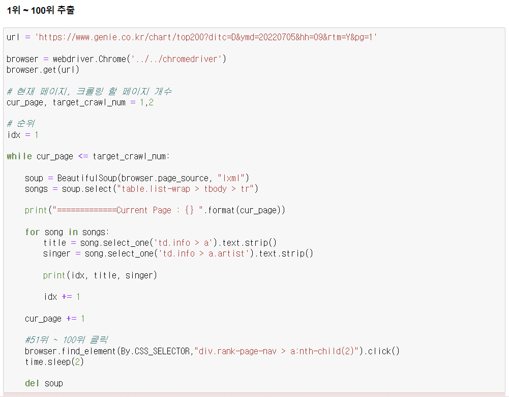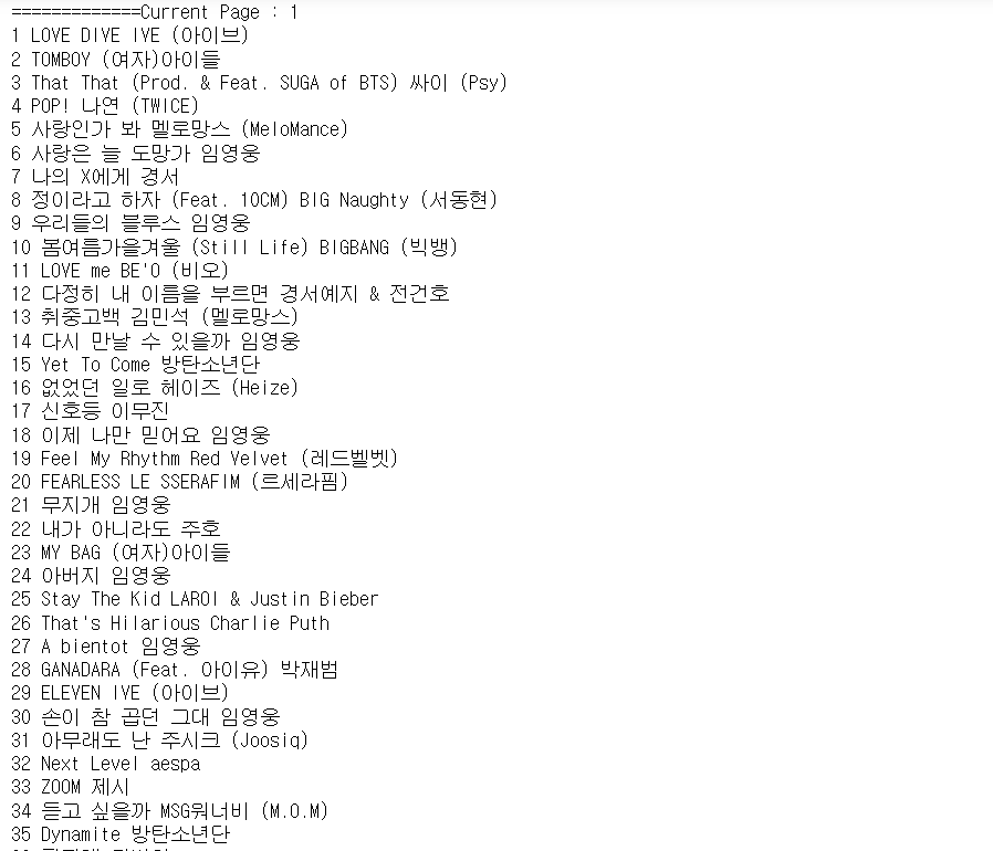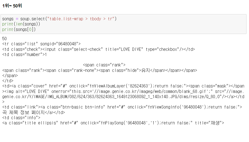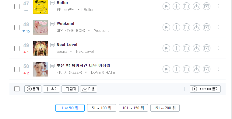 - 1위~50위, 50위~100위 페이지 나누기가 되어 있음