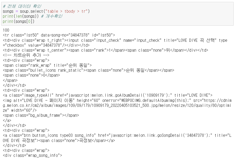 1. 멜론 TOP100 음악 정보 가져오기