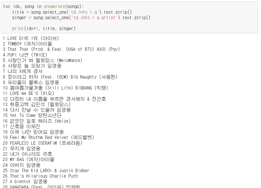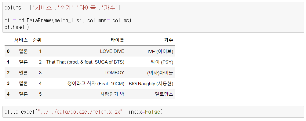 - 순위, 타이틀, 가수 순으로 저장