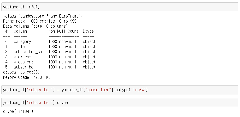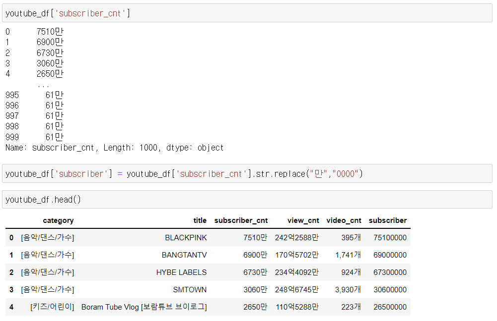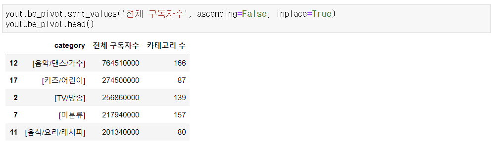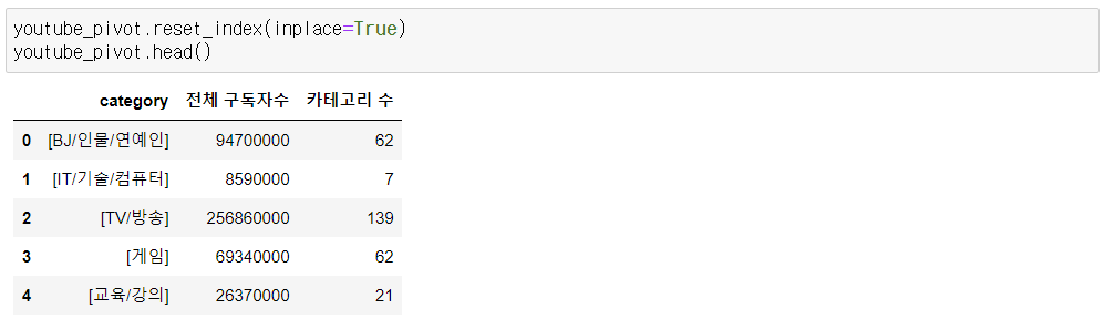 2) 컬럼명 변경 : '전체 구독자수', '카테고리 수'