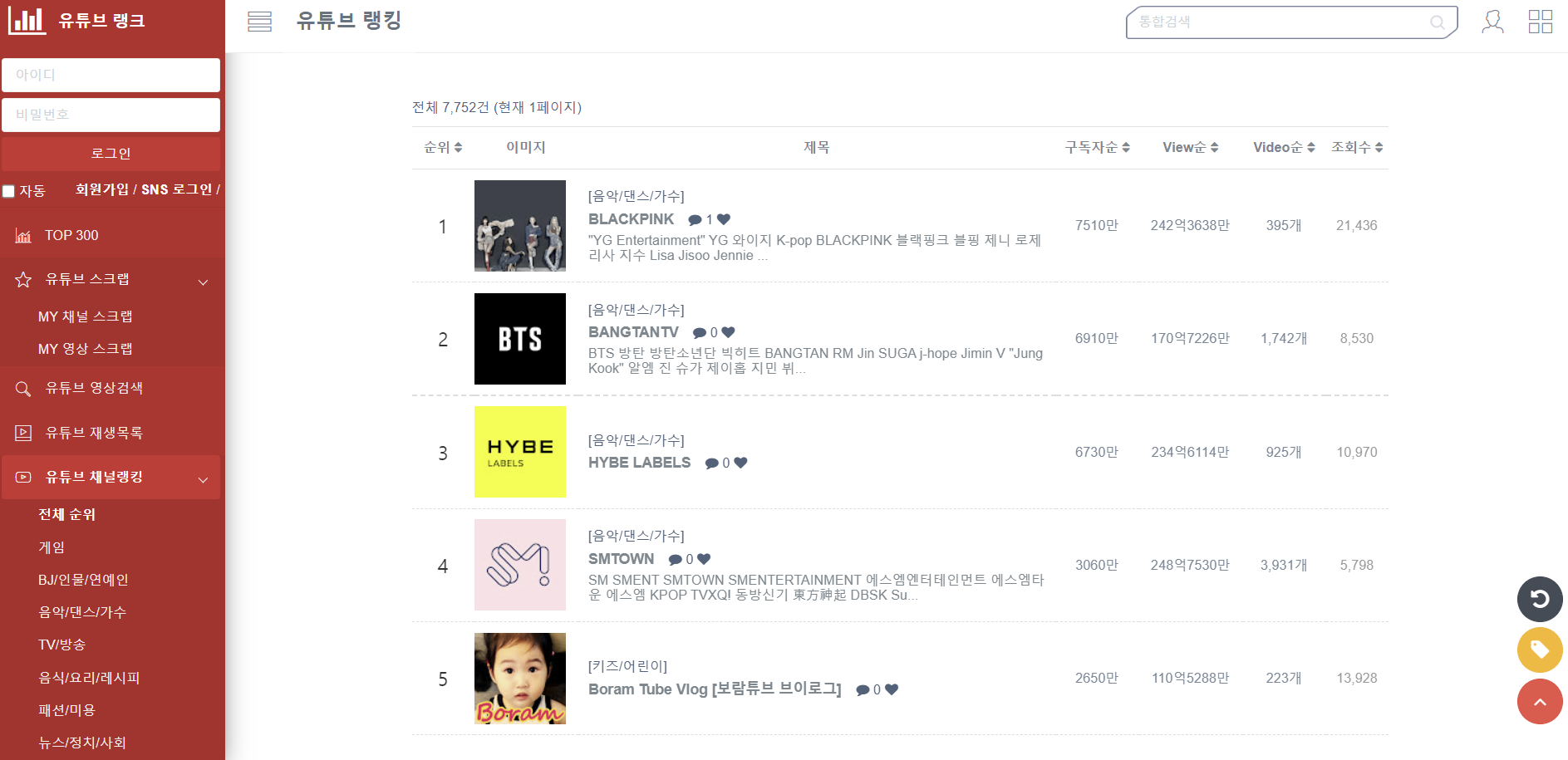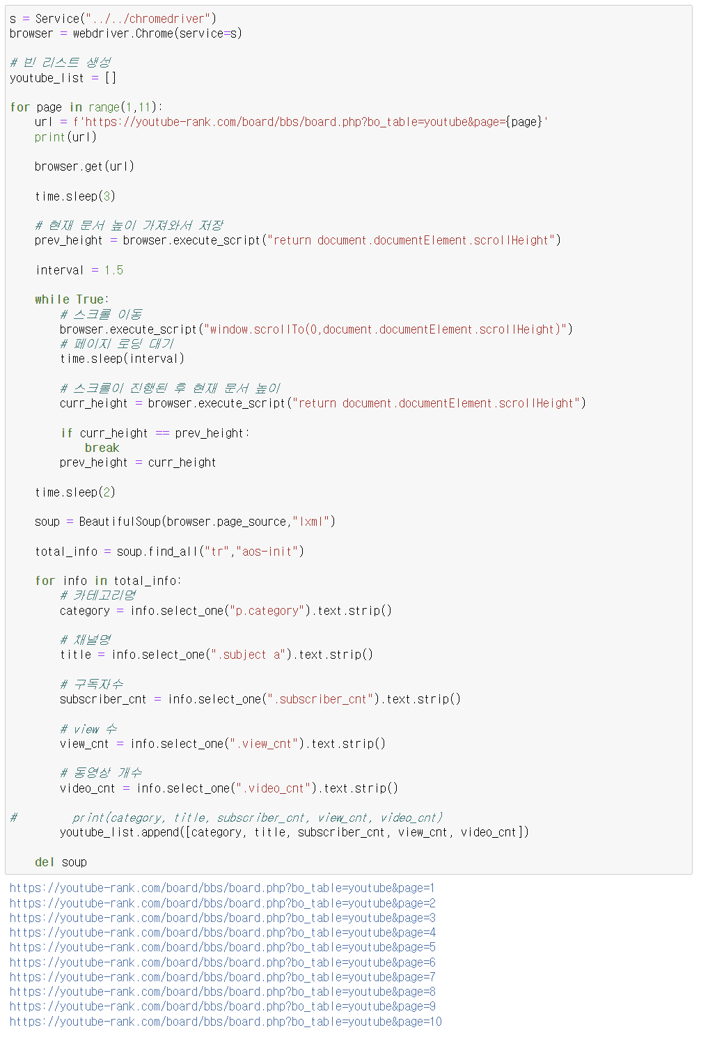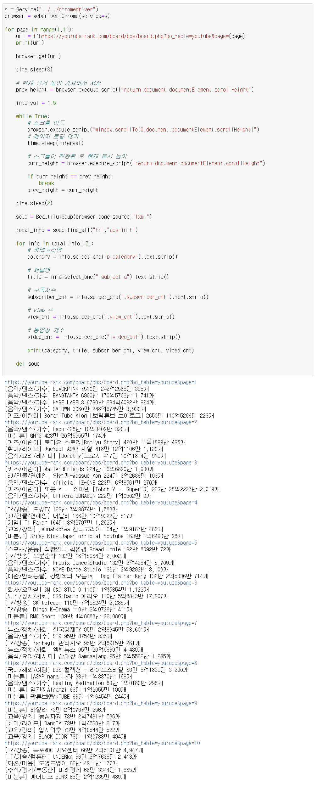 - url : https://youtube-rank.com/board/bbs/board.php?bo_table=youtube&page=1