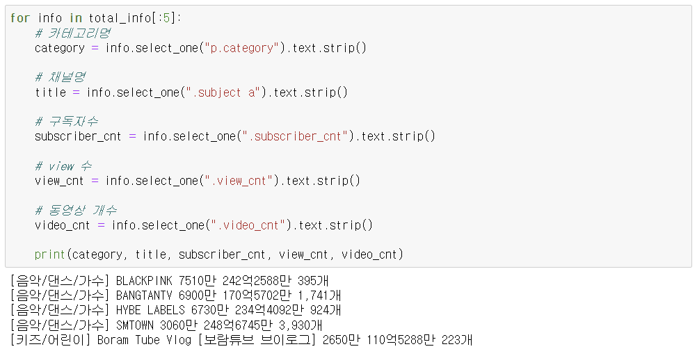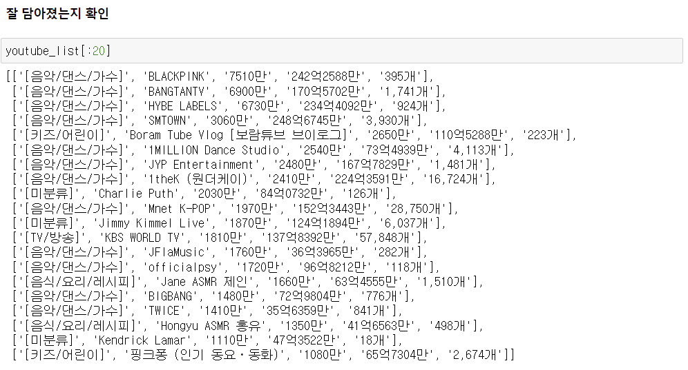 - 카테고리명, 채널명, 구독자수, view 수, 동영상 개수 추출