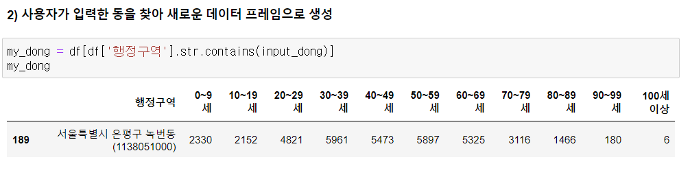 2) 사용자가 입력한 동을 찾아 새로운 데이터 프레임 생성