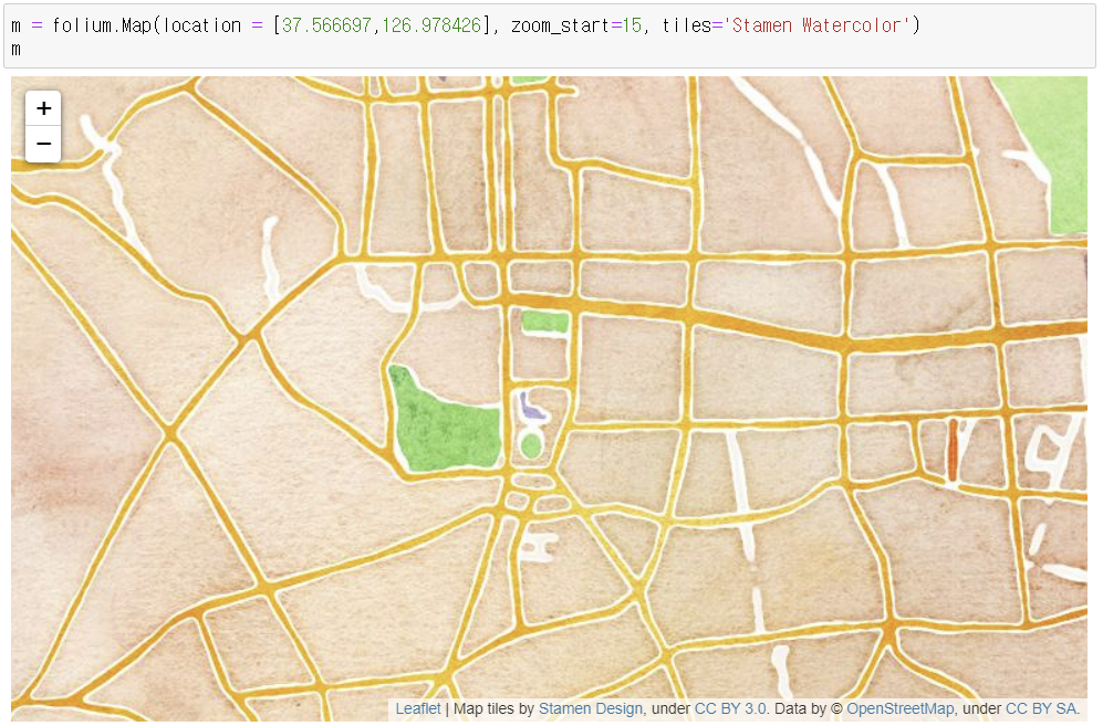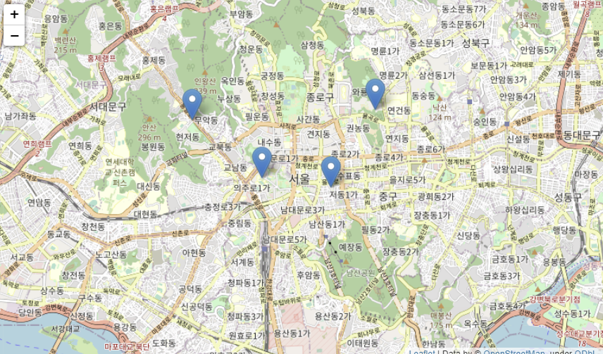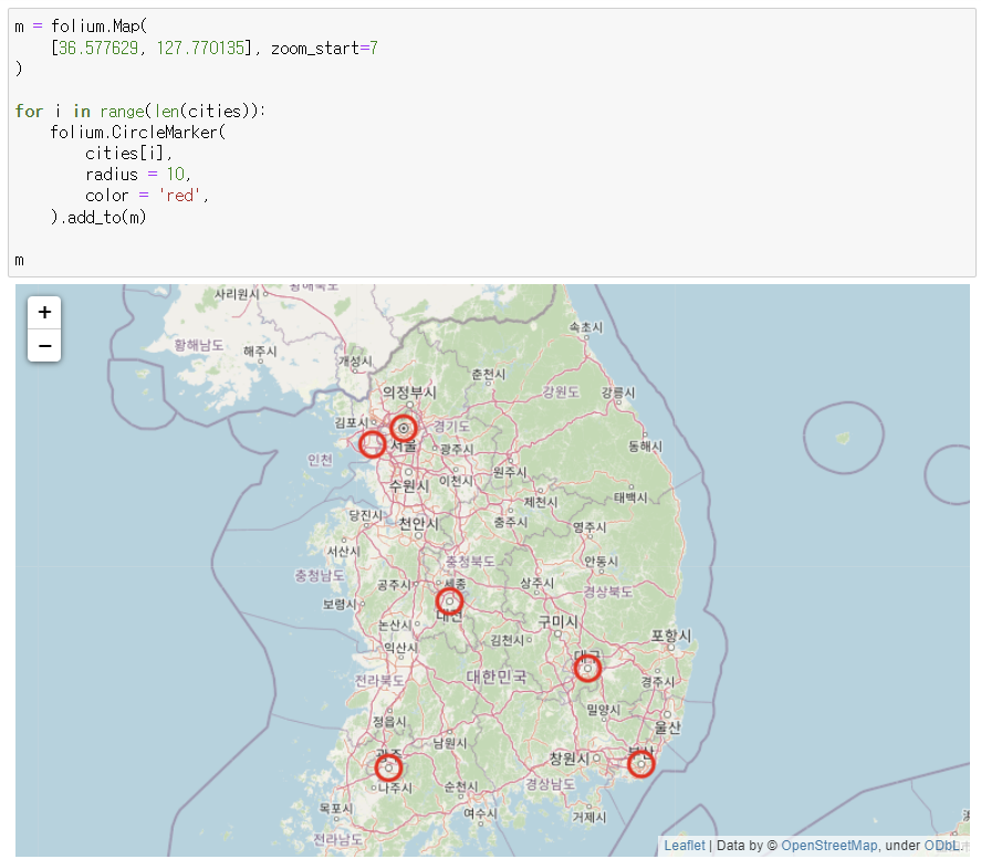 - zoom_start : 지도 확대 출력, 숫자가 커질 수록 확대됨