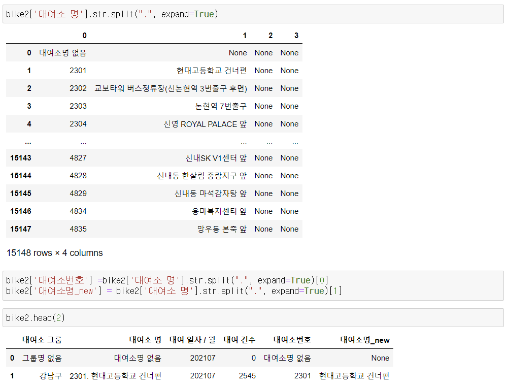 - 대여소번호 컬럼을 생성한 후 대여소명에서 번호를 분리한 값 담기