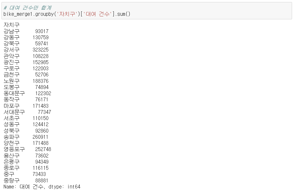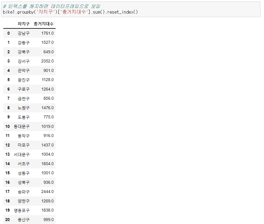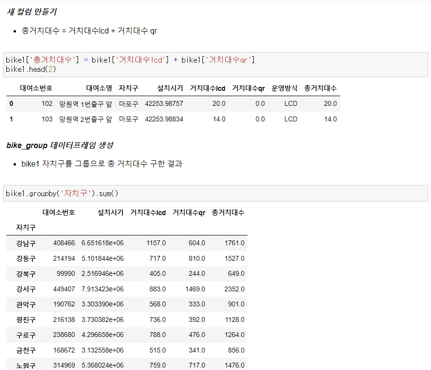 - bike1 자치구를 그룹으로 총 거치대수 구한 결과 => bike_group 데이터 프레임 생성