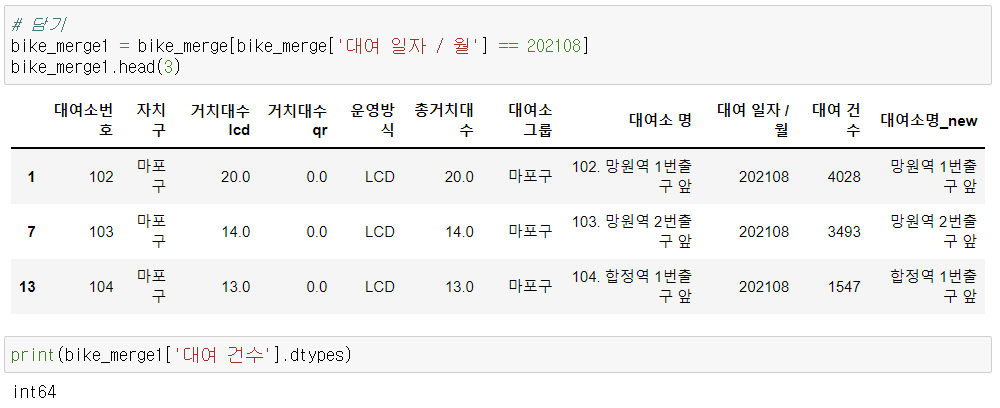 - 대여일자/월 ==> 202108 인 정보만 추출해서 새로운 프레임 생성(bike_merge1)