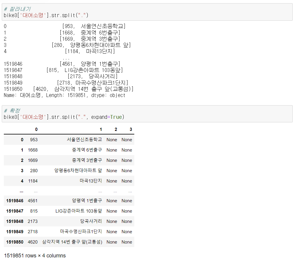 - 대여소번호 컬럼을 생성한 후 대여소명에서 번호를 분리한 값 담기